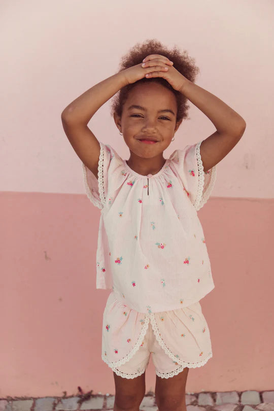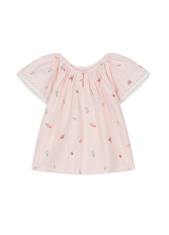 The sweetest striped blouse with all-over embroideries. Front teardrop opening with button. Ruffled sleeves with lace edges and a button placket at the back.