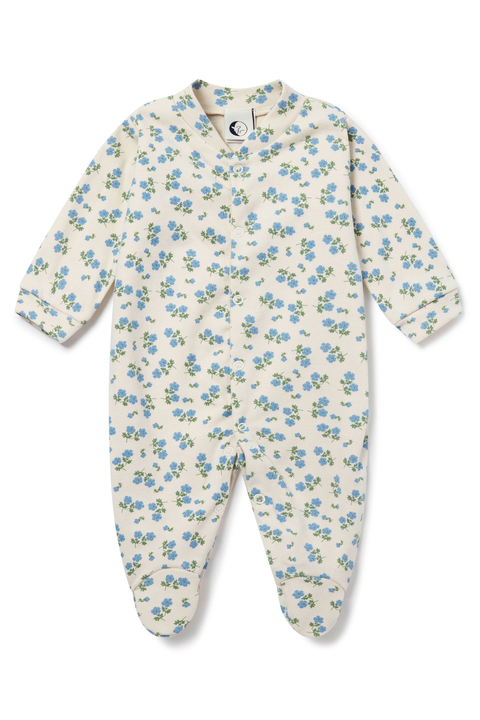 A classic baby sleepsuit in a Pink Tea Floral print. 100% organic cotton, a very soft interlock fabric for maximum night-time comfort.