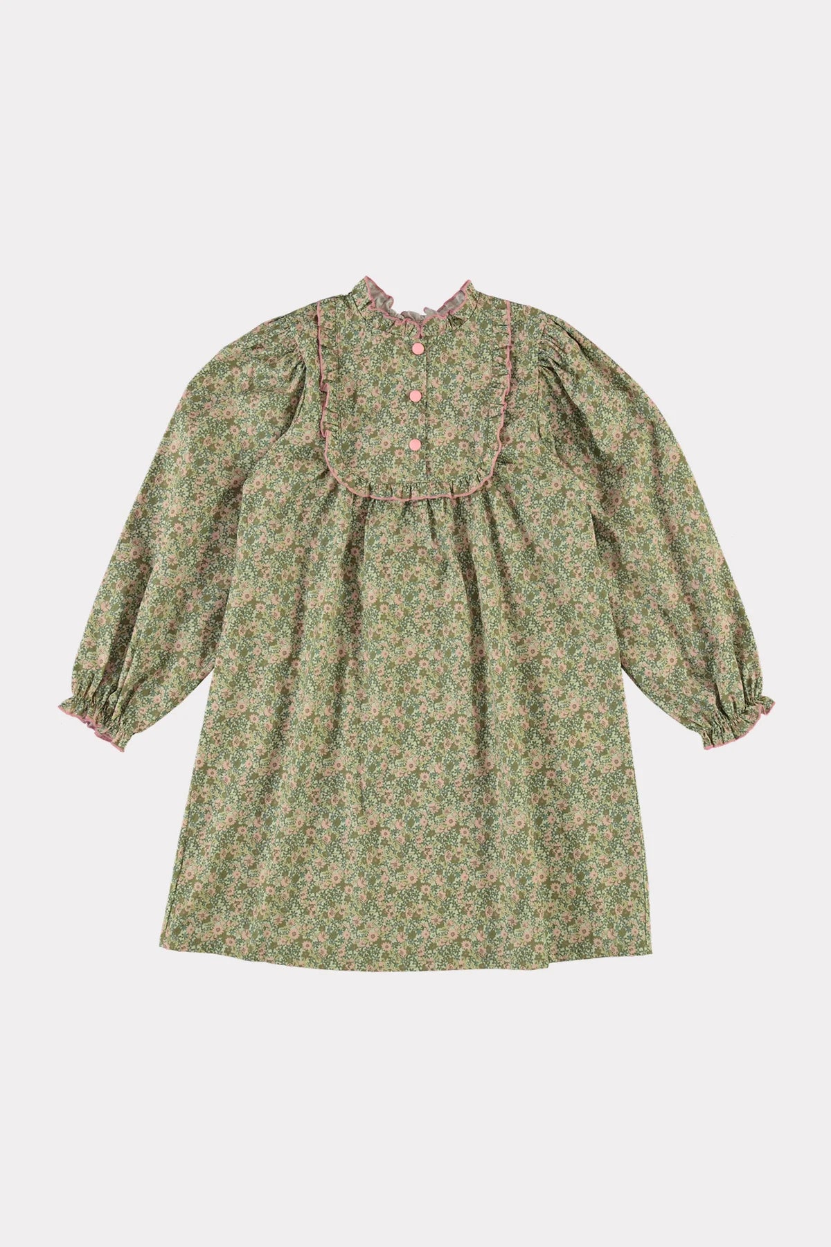 Newest and cutest addition to the collection - Anais dress in signature bohemian garden print in organic cotton. Features long sleeves, darling ruffled collar and front opening with lovely contrast pink buttons and ruffles.