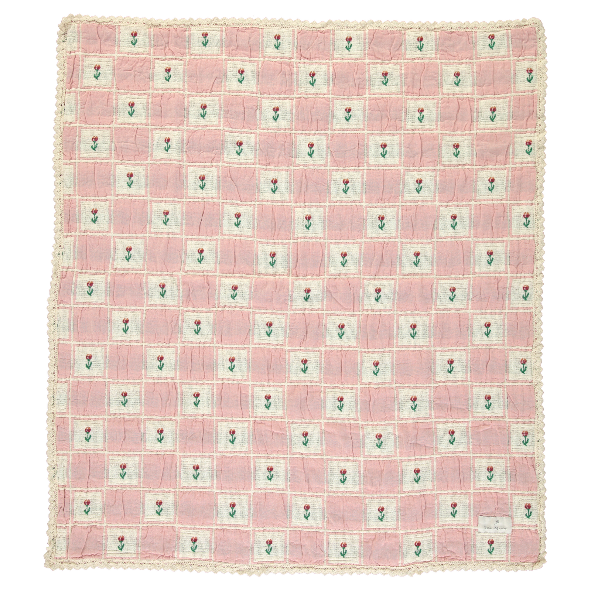 Most adorable patchwork blanket with a vintage tulip jacquard is made from the finest 100% organic cotton in superior quality with cotton lace on the edges. Crafted to be gentle on the most sensitive skin. Sized to snuggle your newborn and not-so-little-ones too. Perfect for gifting!