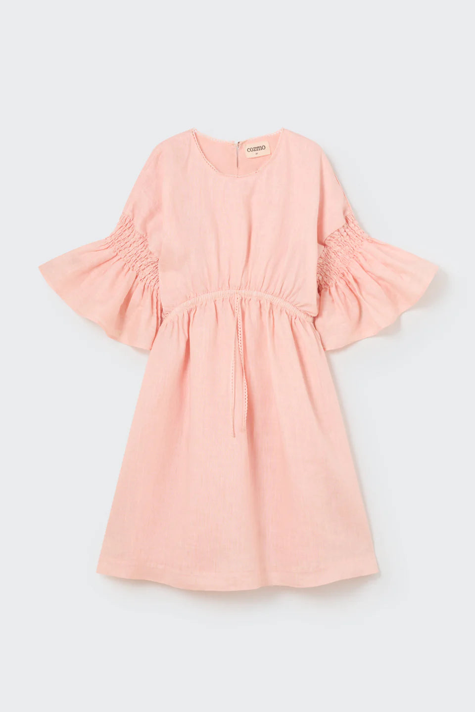 Dress in delicate and highly breathable linen. Round neckline. Buttons at the back. Dropped shoulders. Flounce sleeves with smocking details. Gathered at the upper section. Eyelet details. Lined with cotton voile.