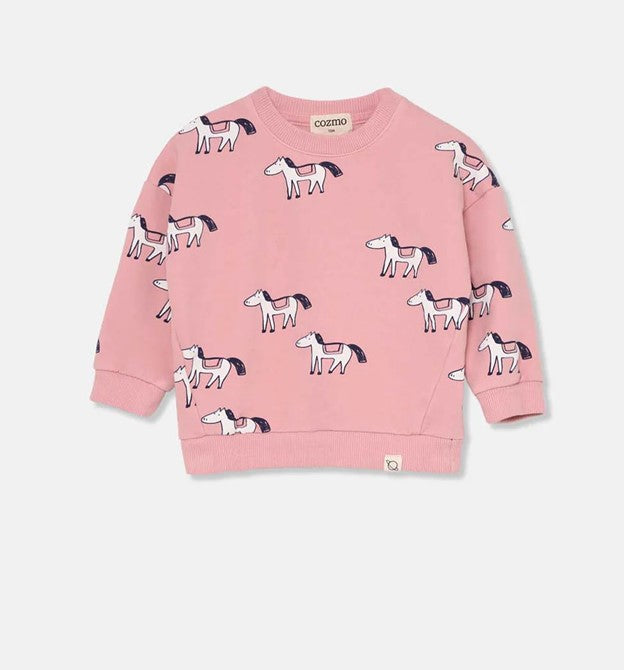 Discover the ultra-smooth surface of our fleece sweatshirt, gently brushed inside to keep your little one cozy. Perfect for babies and toddlers, our sweatshirt features a cute horses graphic print they'll adore. Soft, warm, and designed for snug comfort, it's the ideal choice for cooler days. Your child will love this playful and comfortable addition to their wardrobe.