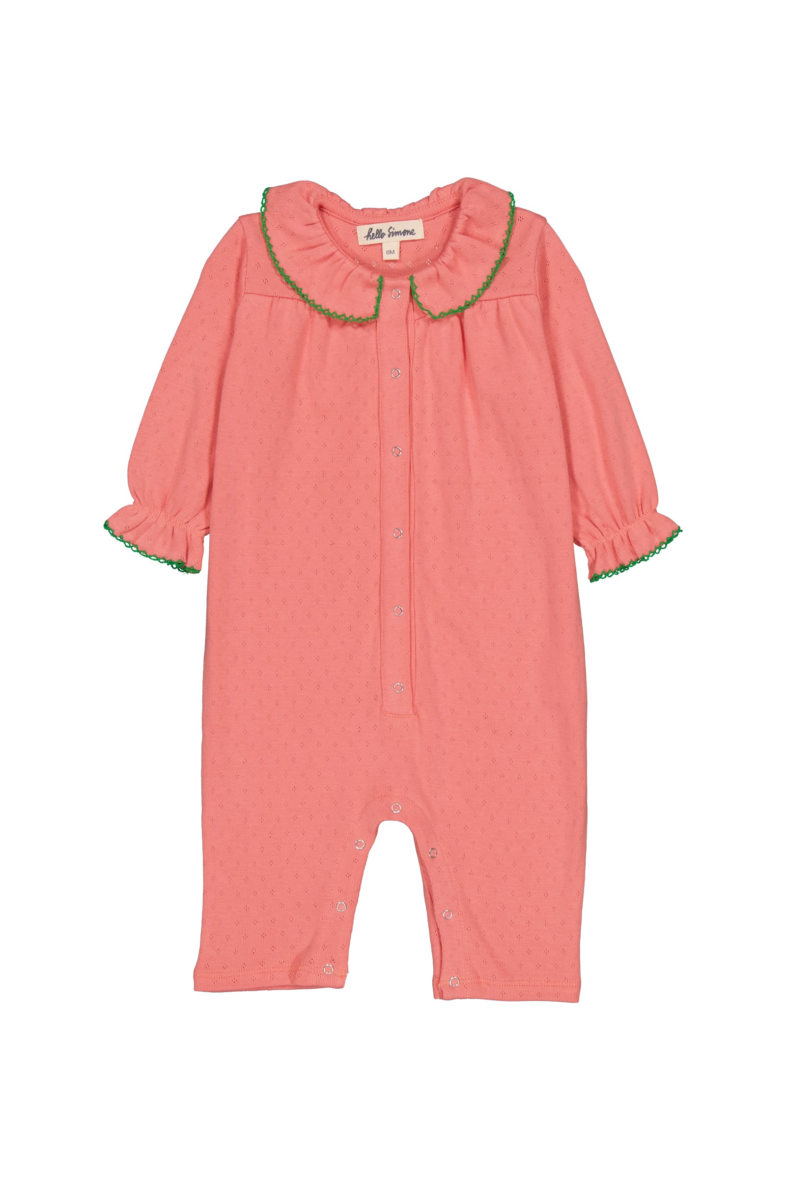 Filou is our adorable, wearable baby jumpsuit. Made from organic cotton pointelle, we love its pretty print and ruffled collar with contrasting croquet finish. It's easy to put on thanks to its front and crotch openings.