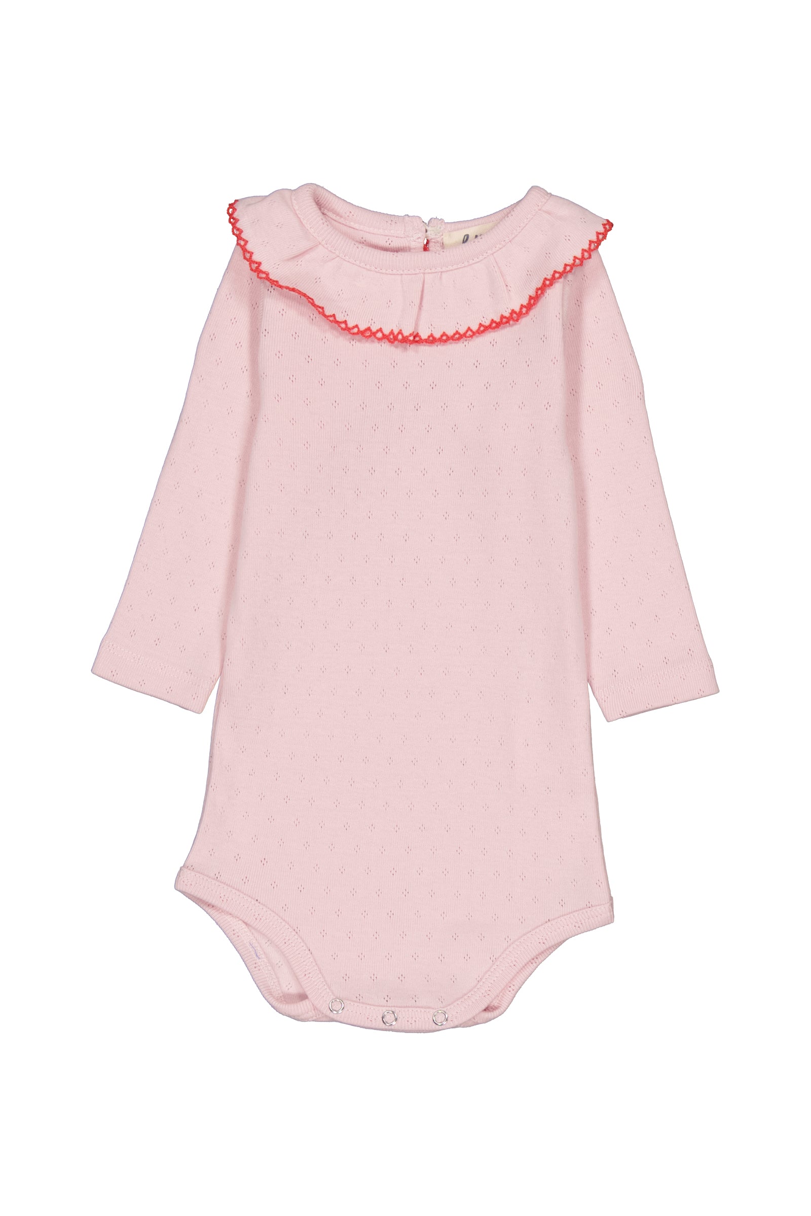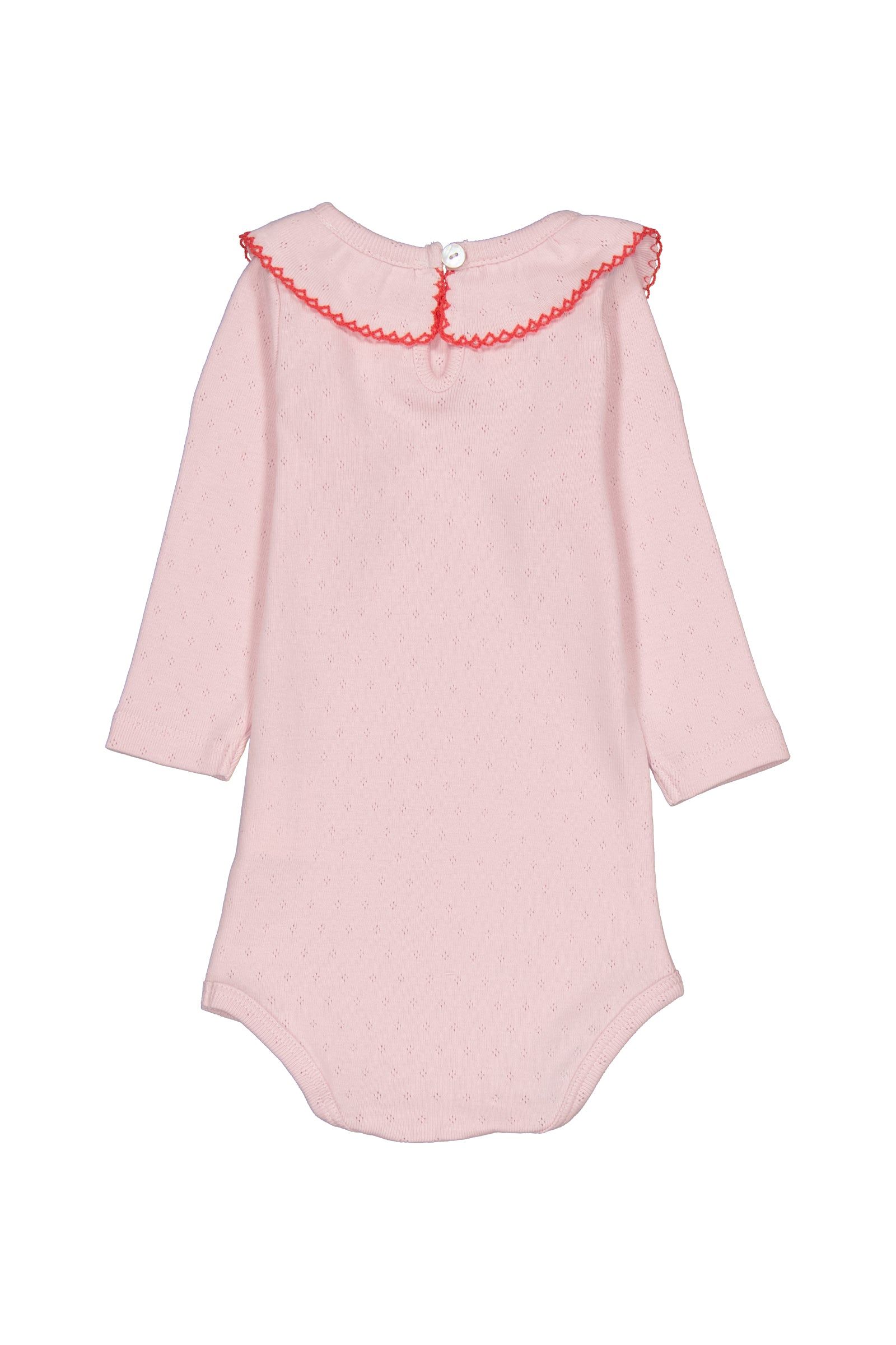 Pernille is our timeless baby bodysuit in organic cotton pointelle. We love its large ruffled collar with contrasting croquet finish. Buttons on the back. Snaps at crotch.