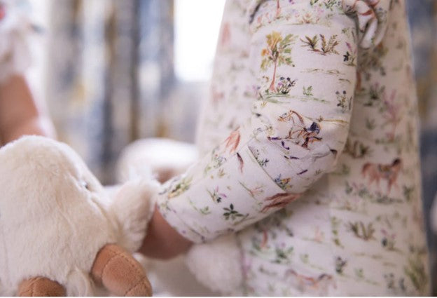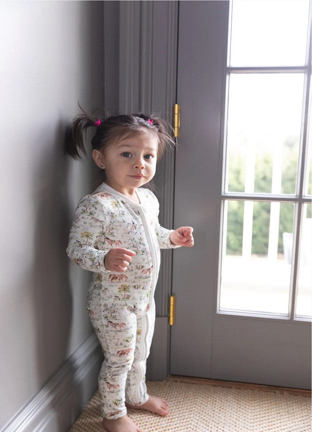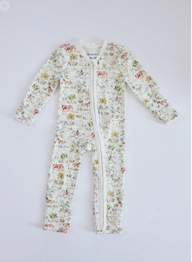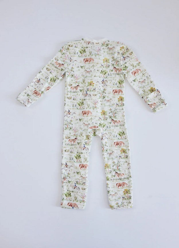 The perfect onesie in the Hunter Pace Horse design. With fold-over hand mittens (for sizes up to 9-12 months) to ensure a peaceful sleep without scratches, fold-over foot cuffs for versatility, and a double zipper for easy diaper changes.