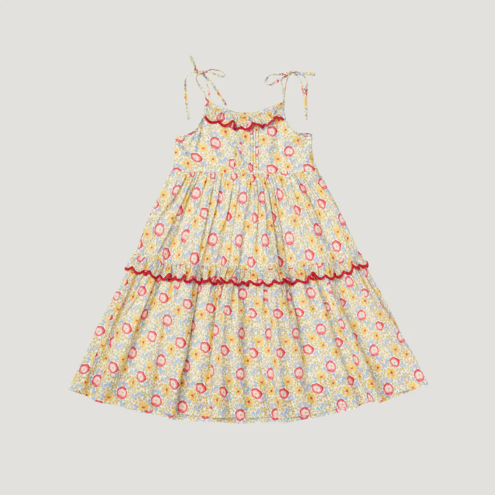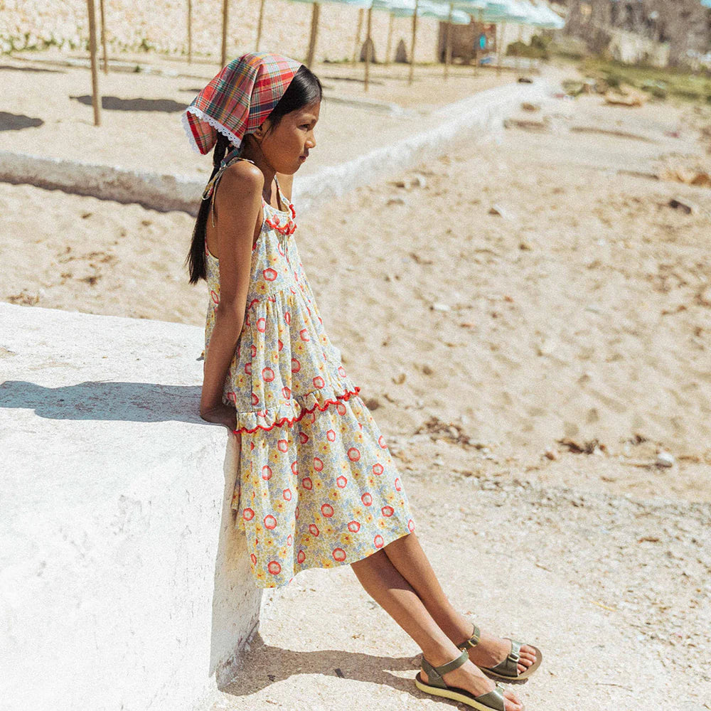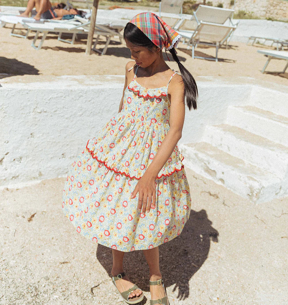 The Ballet Dress in our Poppy Field print brings everyday adventures to life—whether it’s walking to the corner bakery, picking flowers at the weekend market, or twirling down the sidewalk just because. Made from soft, breathable cotton, it features dainty shoulder ties, a pintucked bodice, and a gently tiered skirt that’s perfect for movement and play. With delicate embroidery at the neckline and tier, and a ruffled touch that feels extra special, it’s designed for comfort, charm, and the little moments that make summer feel endless.