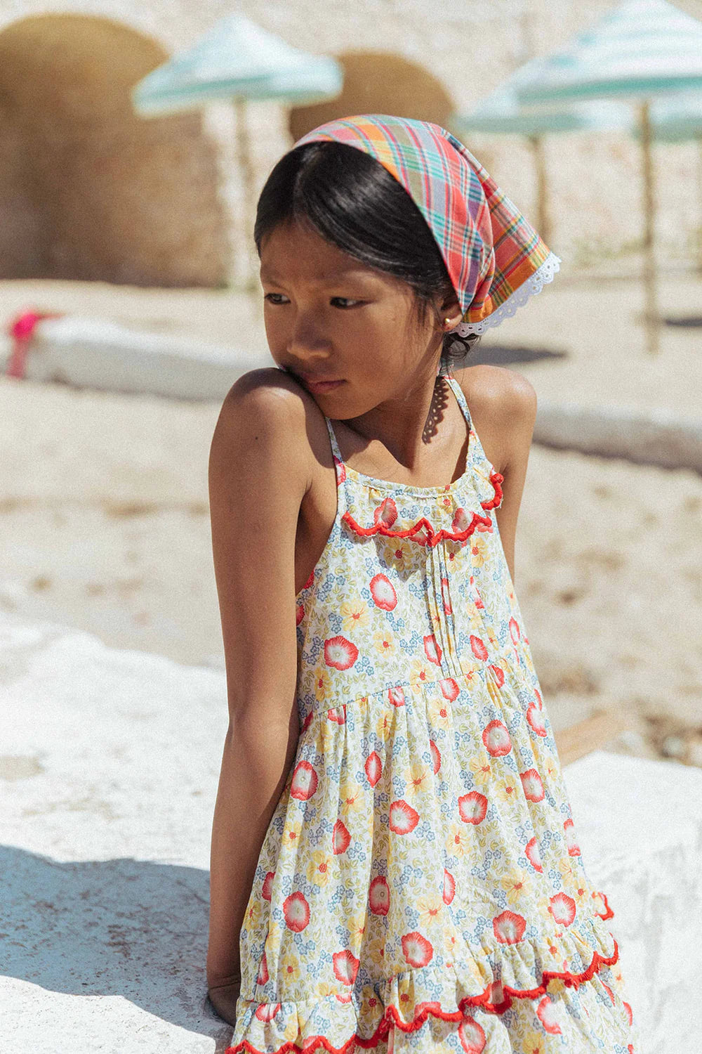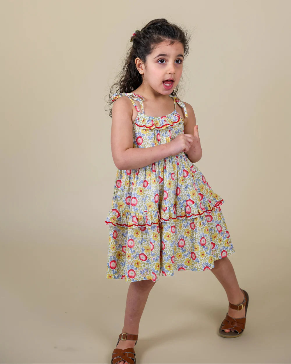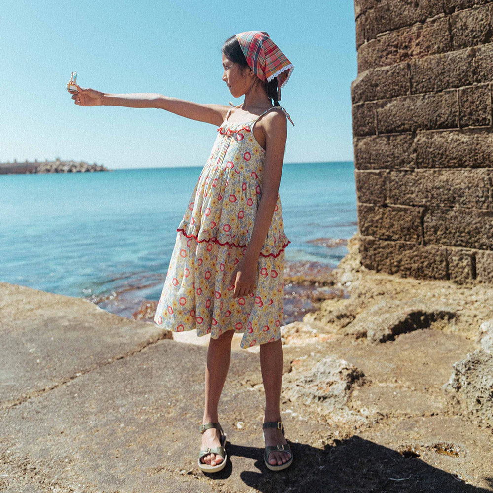 The Ballet Dress in our Poppy Field print brings everyday adventures to life—whether it’s walking to the corner bakery, picking flowers at the weekend market, or twirling down the sidewalk just because. Made from soft, breathable cotton, it features dainty shoulder ties, a pintucked bodice, and a gently tiered skirt that’s perfect for movement and play. With delicate embroidery at the neckline and tier, and a ruffled touch that feels extra special, it’s designed for comfort, charm, and the little moments that make summer feel endless.