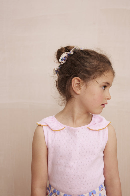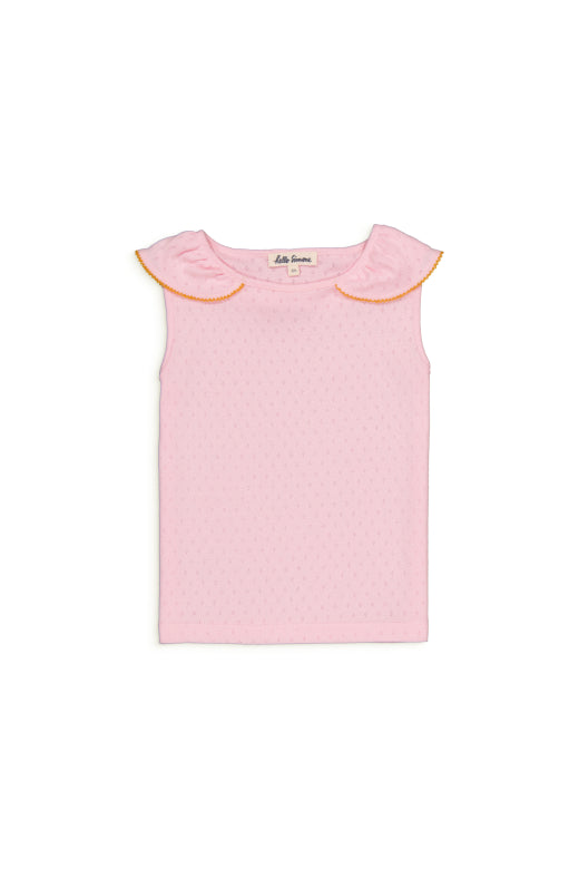 Pointelle top without sleeve. Rounded neckline with flying and contrasted croquet stitch.