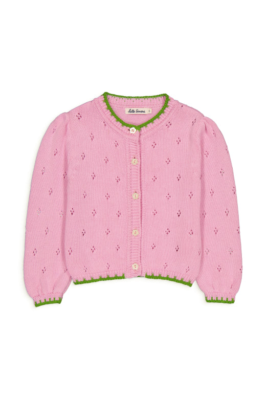 Fancy knitted cardigan with contrasted festoon. Long sleeves with gathers. Flowers buttons.
