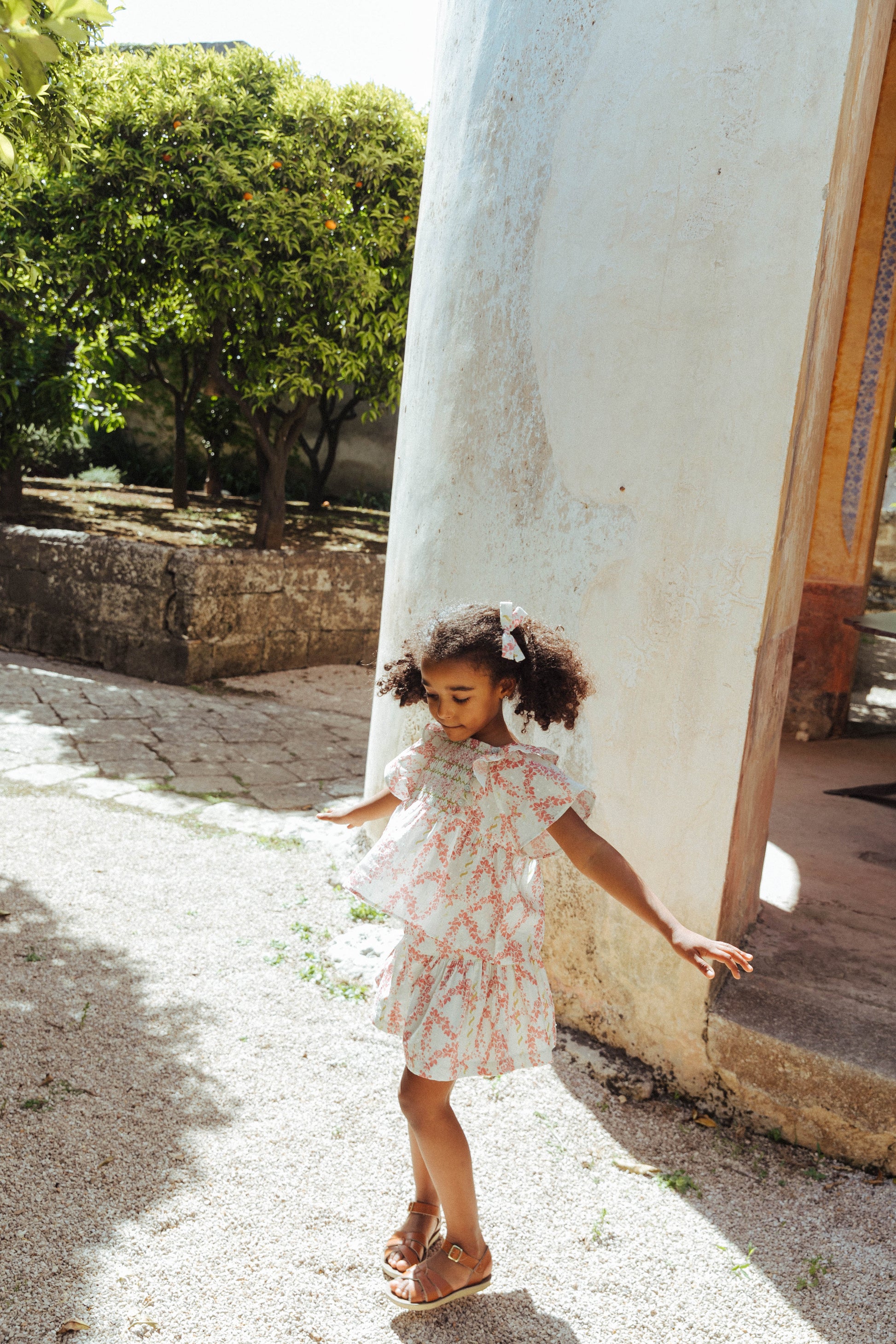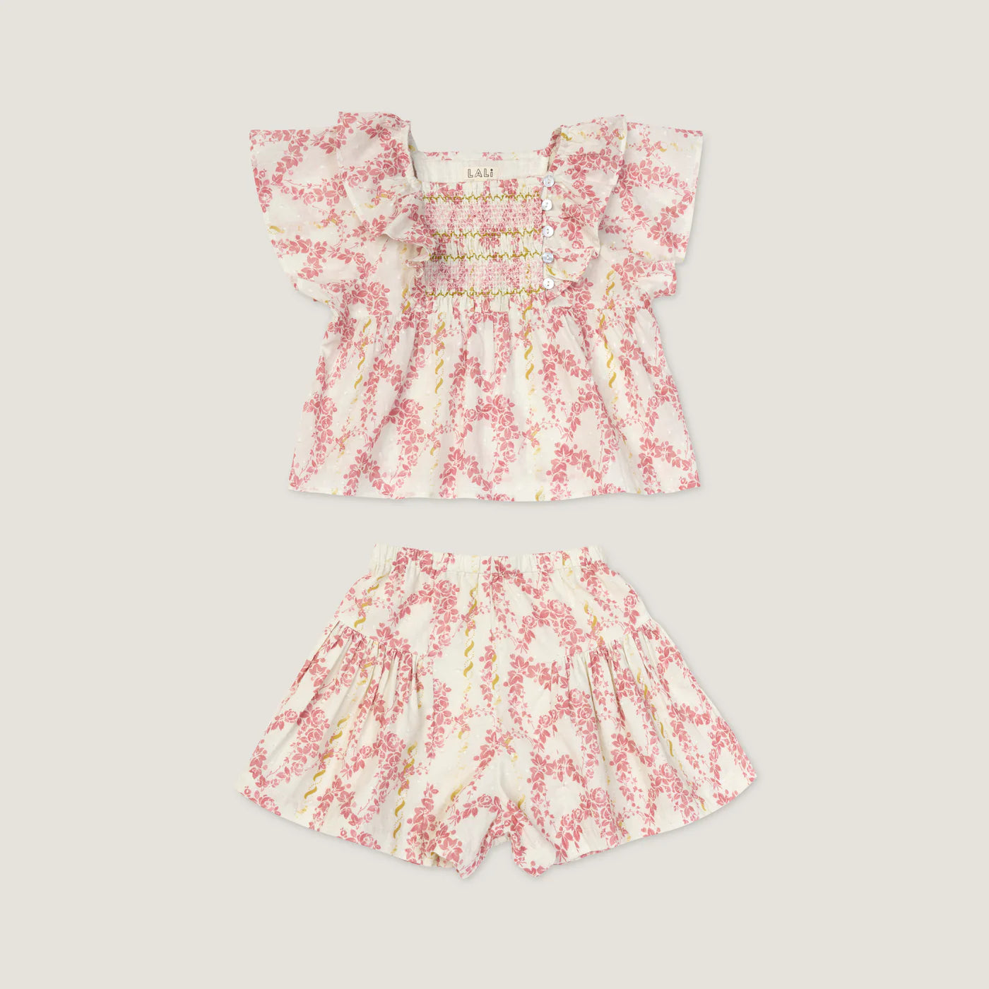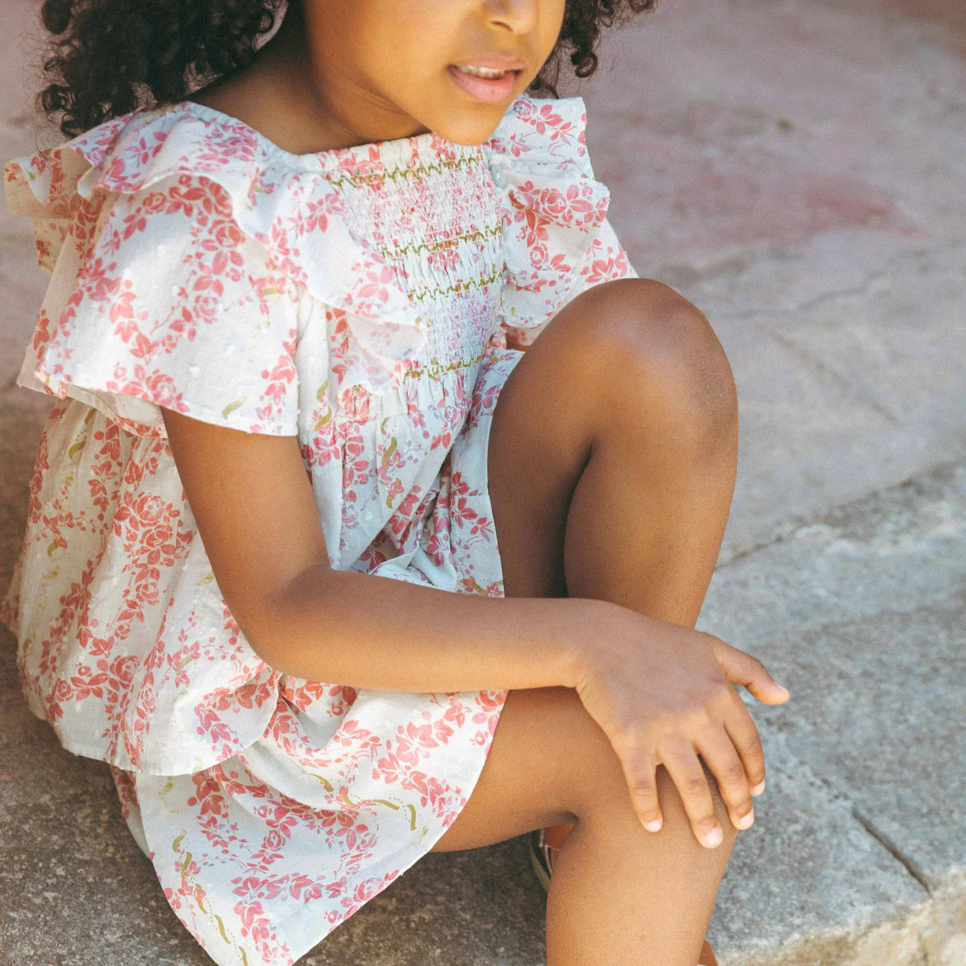 The Lucia Short Set in Climbing Roses Print is a new style for the SS25 season. Fully lined in the bottom and made from 100% cotton, Lucia is a playful separates set perfect for vacation, the playground, or warm-weather events. The top has a mother-of-pearl button and loop closure at the bodice, complete with smocking at the bib. Free flowing ruffle sleeves and an elastic-waist allow for optimal comfort. 100% cotton, fully lined.