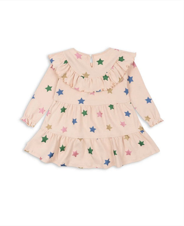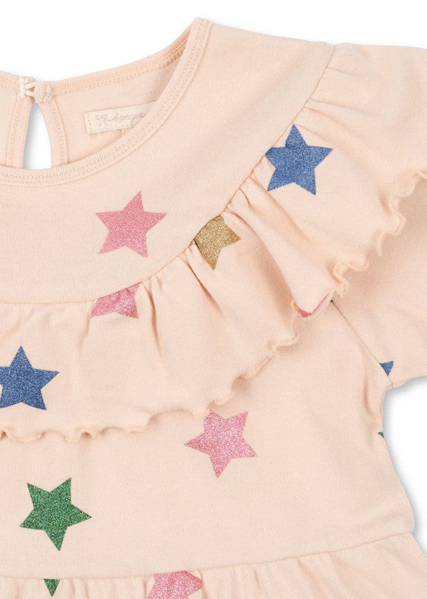 Soft cotton dress with sparkling glitter details. Designed with a slightly flared and layered skirt.
