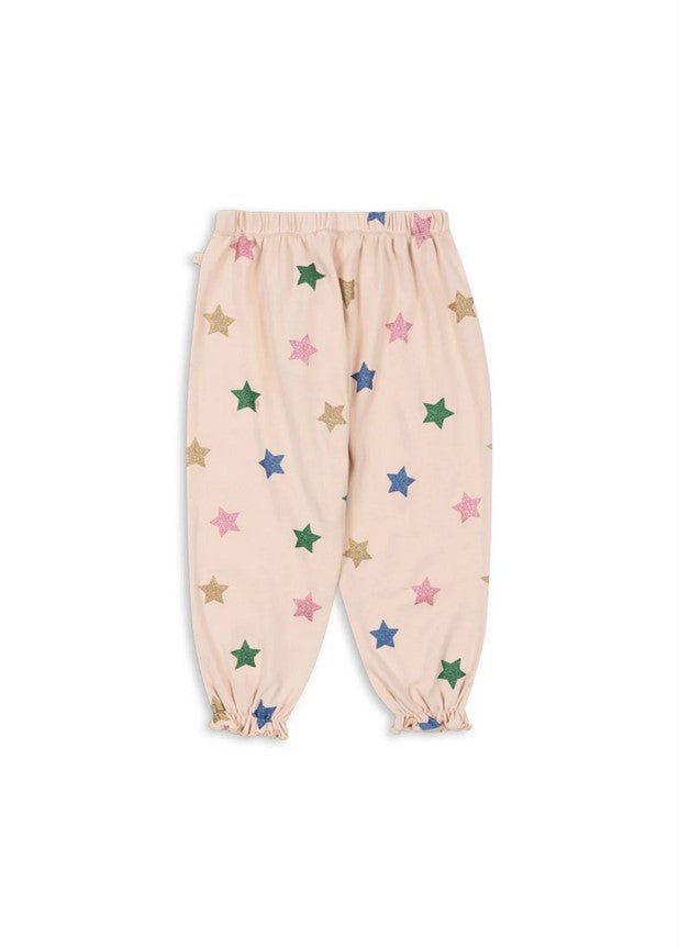 Soft cotton pants with sparkling glitter details. Features a comfortable elastic waistline.