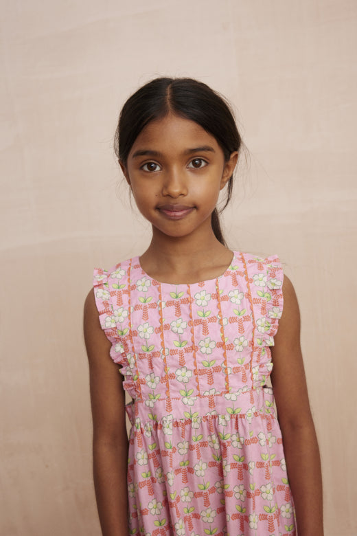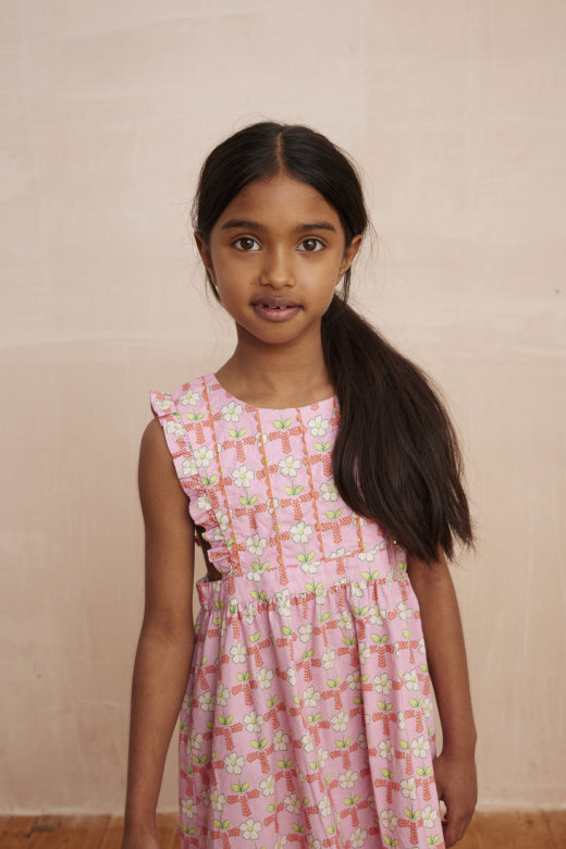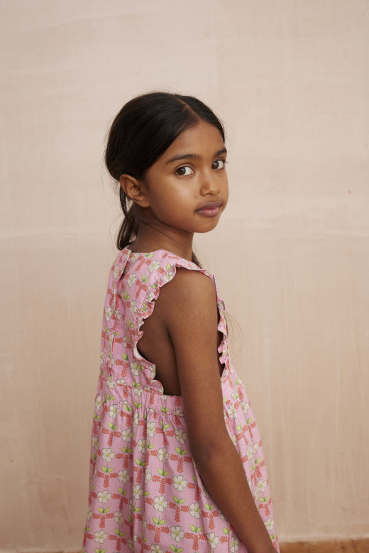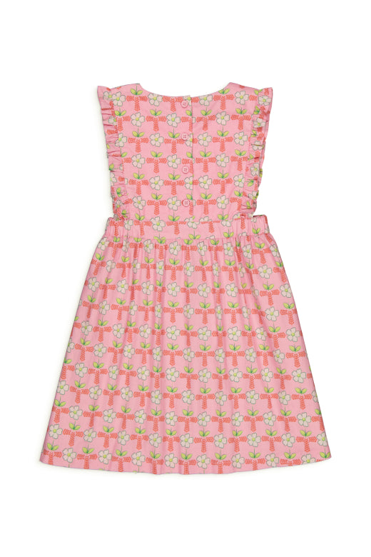 Knee-length all-over print poplin dress. Top front with inlaid green ric rac and ruffled armholes. Round collar and button back. High waist with elasticated back and gathered skirt.