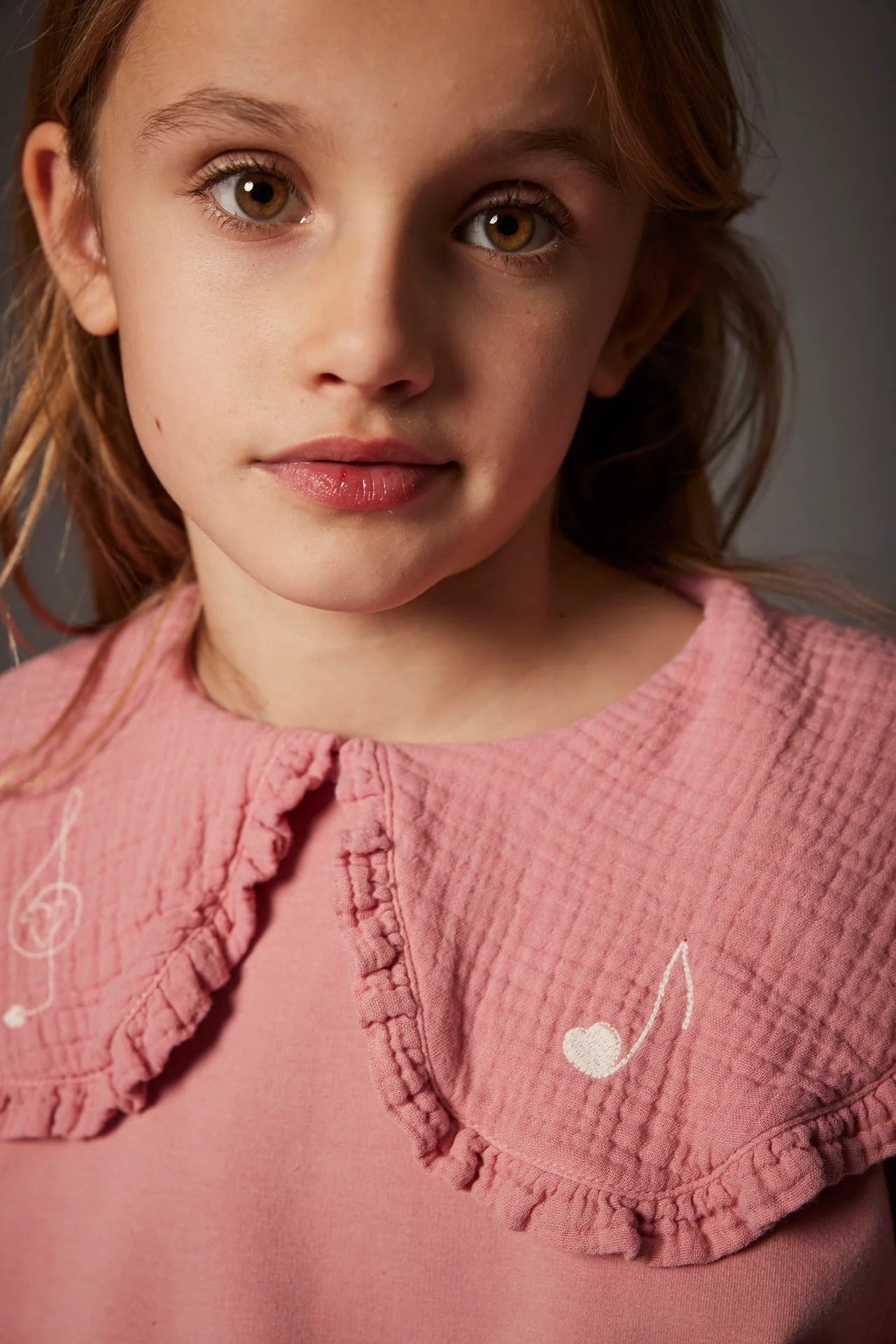 Part of Cozmo’s organic cotton kid's collection, this girls’ sweatshirt is crafted from premium brushed fleece for exceptional warmth and comfort. It features a Peter Pan collar made of textured fabric with a ruffled trim and embroidered musical details. The puffed long sleeves with elastic cuffs and an elastic hem provide a secure, cozy fit. A teardrop closure at the back adds an easy dressing detail. Smooth on the outside and soft, warm, and cozy inside, this sweatshirt is perfect for chilly days.