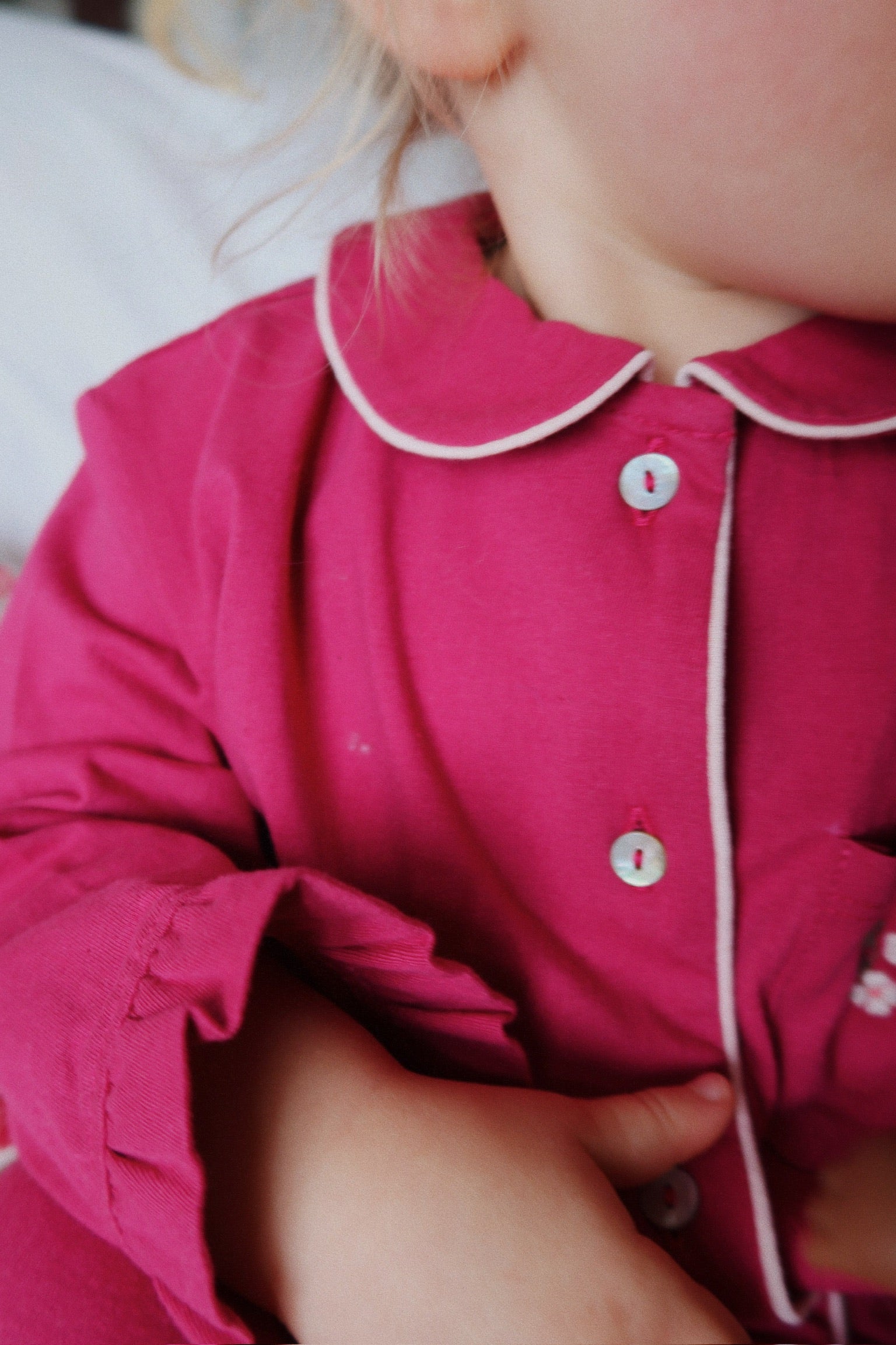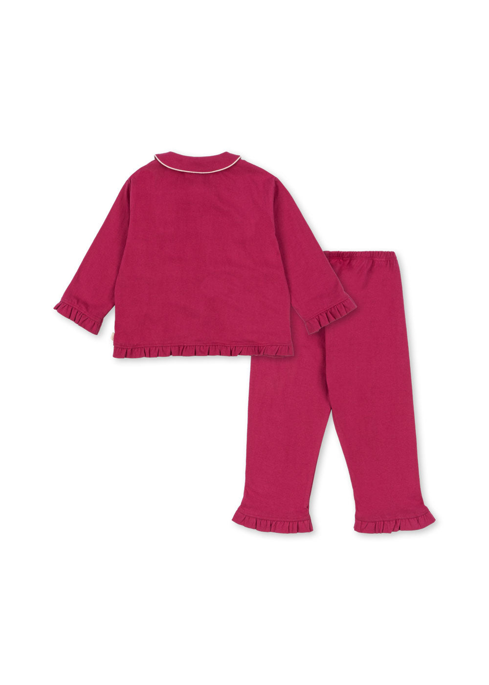 Soft jersey set made for slow and comfy days at home. The set includes a classic pyjama shirt and soft pants with frill detailing. Made from 100% organic cotton