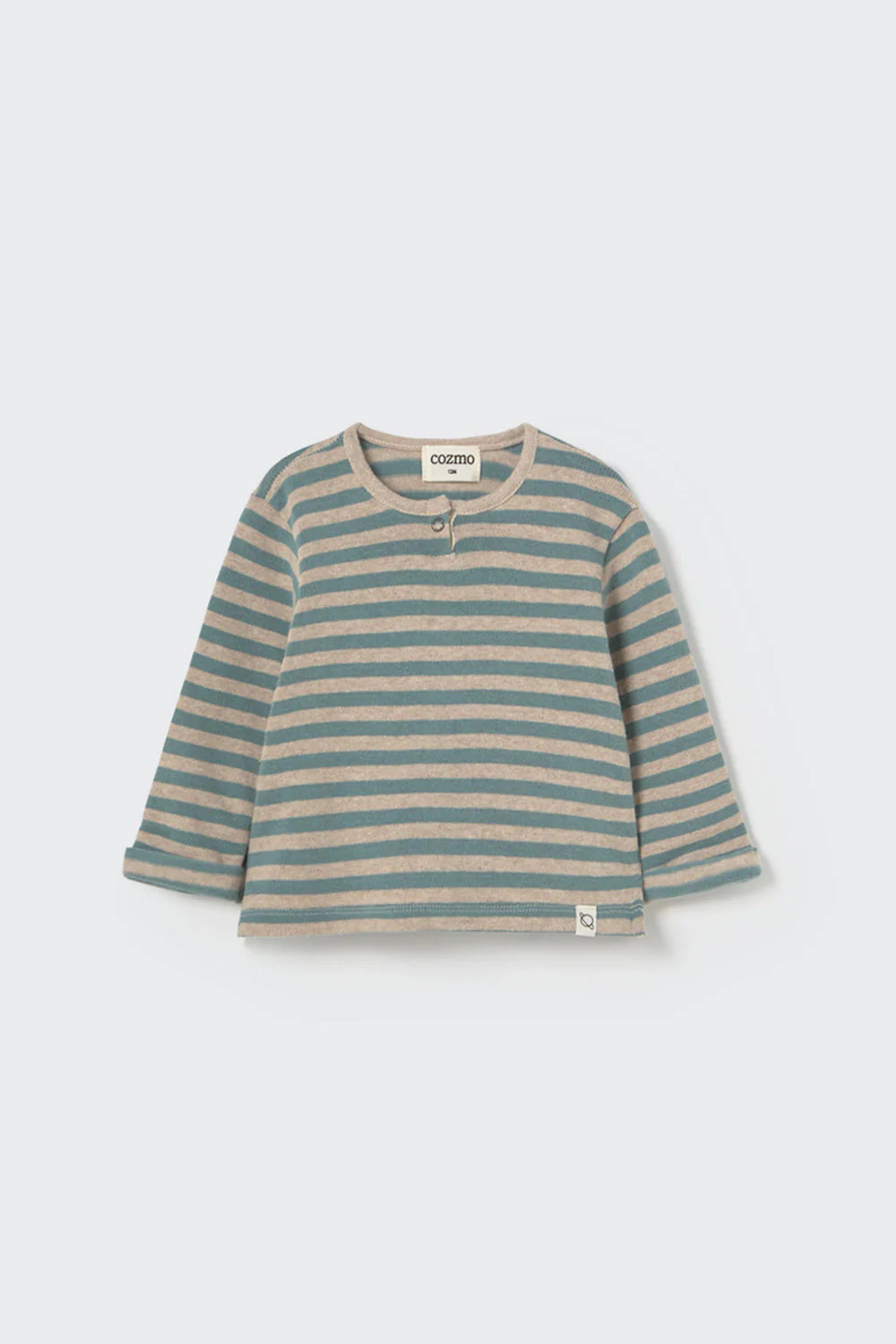 Striped baby sweater in soft knit, brushed inside and out for extra warmth and a gentle, pleasant feel. It features a contrasting solid-color crew neckline with a snap button closure at the front for easy dressing. Rolled-up cuffs and side slits add relaxed finishing touches to this cozy essential, perfect for layering on chilly days.