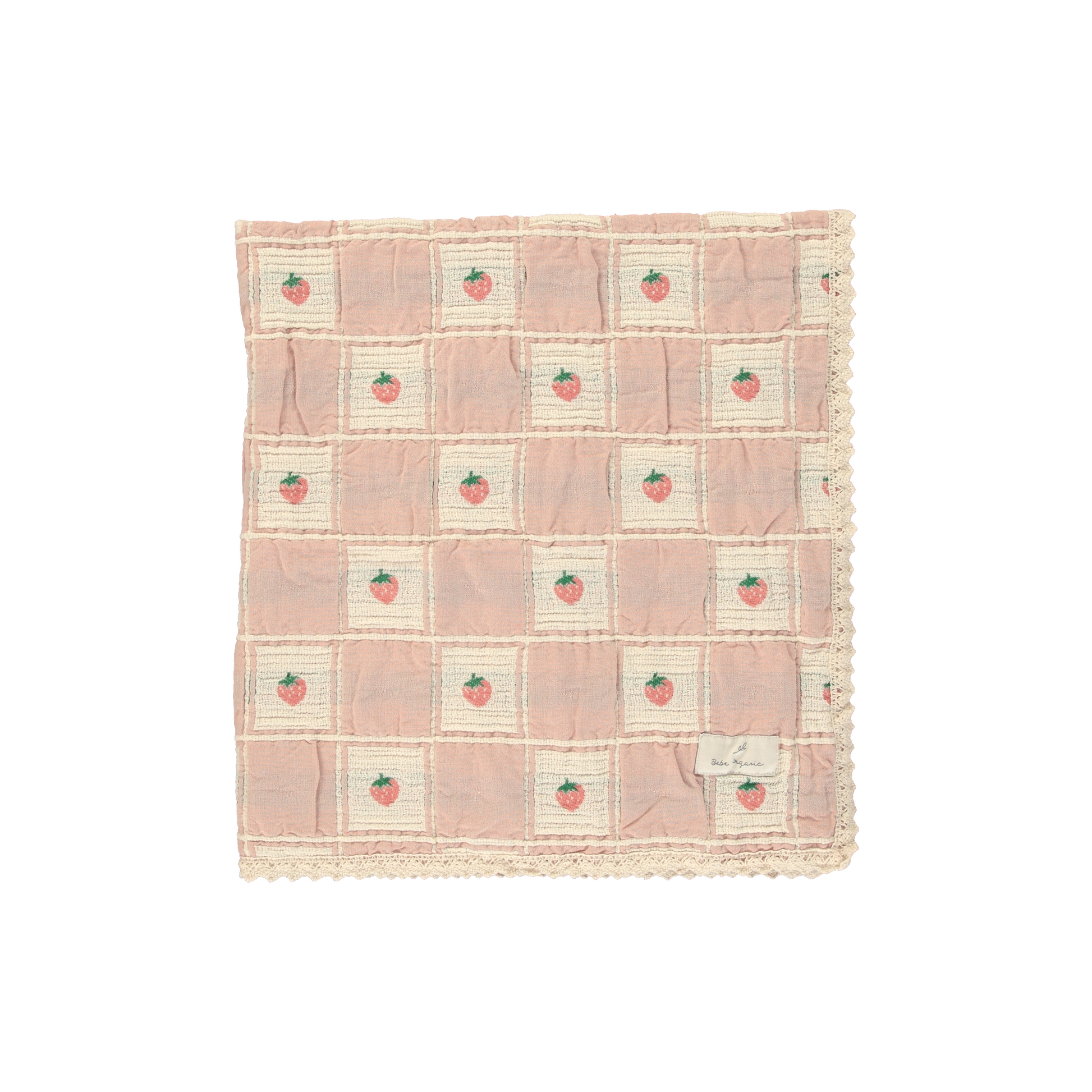 Beloved Strawberry patchwork blanket. This most adorable blanket is crafted from the finest 100% organic cotton in superior quality with cotton lace on the edges and a playful strawberry motif. Crafted to be gentle on the most sensitive skin. Sized to snuggle your newborn and not-so-little ones too. Perfect for gifting!